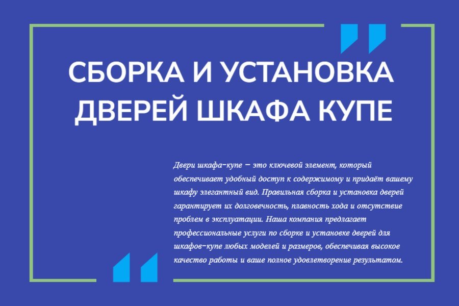 Двери шкафа-купе – это ключевой элемент, который обеспечивает удобный доступ к содержимому и придаёт вашему шкафу элегантный вид. Правильная сборка и установка дверей гарантирует их долговечность, плавность хода и отсутствие проблем в эксплуатации. Наша компания предлагает профессиональные услуги по сборке и установке дверей для шкафов-купе любых моделей и размеров, обеспечивая высокое качество работы и ваше полное удовлетворение результатом.