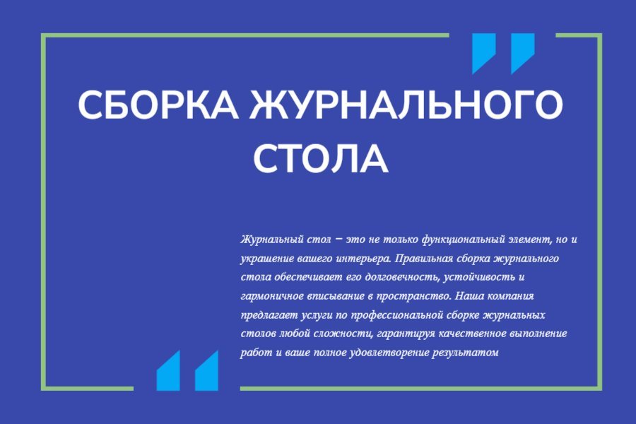 Журнальный стол – это не только функциональный элемент, но и украшение вашего интерьера. Правильная сборка журнального стола обеспечивает его долговечность, устойчивость и гармоничное вписывание в пространство. Наша компания предлагает услуги по профессиональной сборке журнальных столов любой сложности, гарантируя качественное выполнение работ и ваше полное удовлетворение результатом.