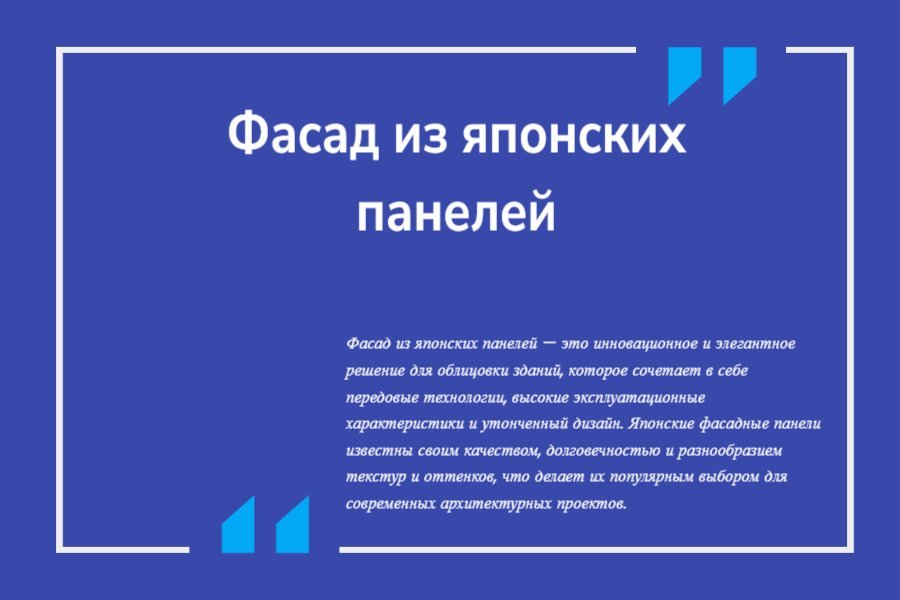 Фасад из японских панелей — это инновационное и элегантное решение для облицовки зданий, которое сочетает в себе передовые технологии, высокие эксплуатационные характеристики и утонченный дизайн. Японские фасадные панели известны своим качеством, долговечностью и разнообразием текстур и оттенков, что делает их популярным выбором для современных архитектурных проектов.